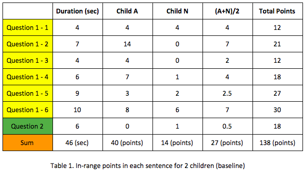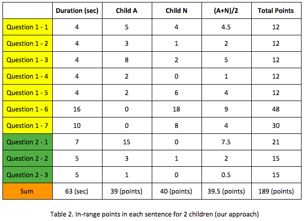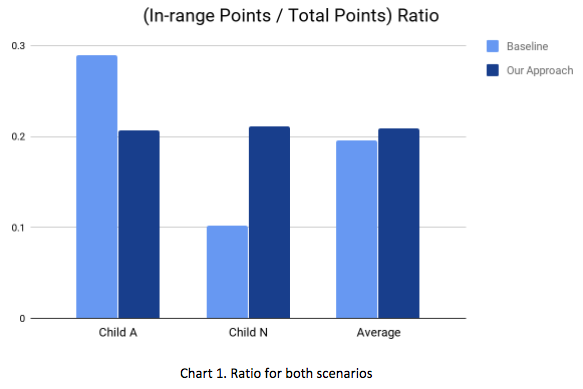 For our first hypothesis (H1), we use the (In-range Points) / (Total Points) value as an metric to measure the degree of concentration in experiments. From Table 1 (baseline) and Table 2 (our approach), we can see child A’s ratio is 0.71 times smaller, while child N’s ratio is 2.09 times larger. If we calculate the average of A and N, the ratio is 1.07 times larger. (Chart 1).