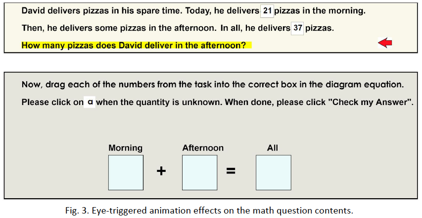 When dealing with an unfamiliar math problem, it is important to read the question description carefully, in order to understand the question completely and conceive the way quickly to find correct answer. For young children learners who often make mistakes in math learning, sometimes themselves and their parents just blame these mistakes on carelessness lightly and make no effort to correct this bad habit. Actually, a majority of them do not fully understand the true meaning of questions so as to make mistakes in their later process of problem solving. And the misunderstanding of questions partly could be attributed to their distractions of the question reading. Especially for children who have learning disability (LD), it is even more difficult for them to sustain their attention on the given task (Richards et al., 1990). In order to solve this problem of distraction during the question reading, we propose to use eye-triggered animation to help to enforce children’s concentration during this process. This solution may improve their later problem solving process and math studying.