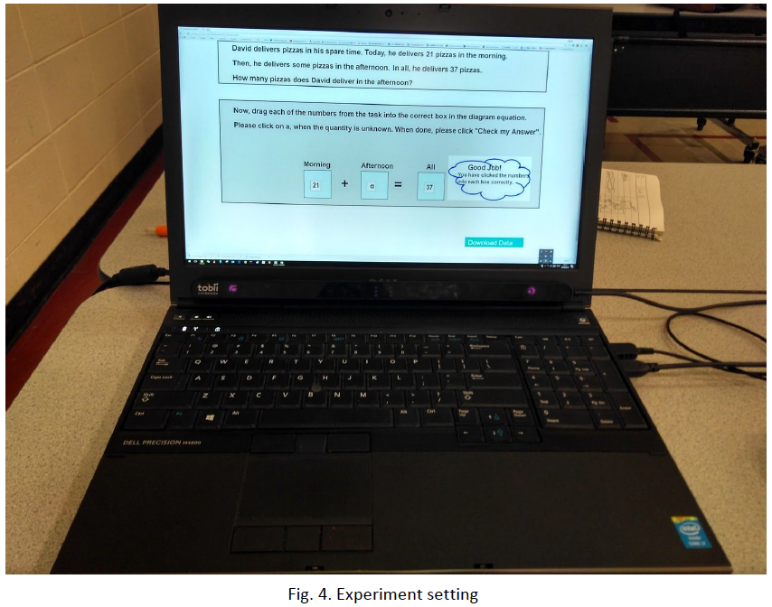 Due to the limited precision of the eye-tracking device, it is hard to detect which line the children learner is focusing on. So we modified the linewidth of the layout (Fig. 2) to make sure a relatively accurate detection of the eye gaze position. Beside, as the whole area consists of two parts: one is for question comprehending, another one is for problem solving, we separate them in a clearer way in the visual presentation.
